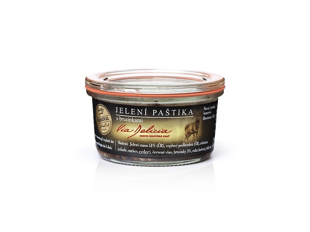 Složení: Jelení maso 51%, vepřový podbradek, zelenina (cibule, mrkev, celer), červené víno, brusinky 3%, cukr, koření, jedlá sůl