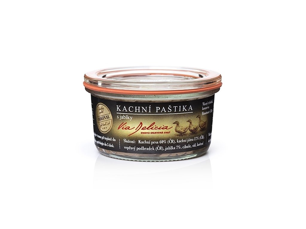 Složení: kachní maso 60%, kachní játra 17%, vepřové maso, jablka, cibule, jedlá sůl, koření