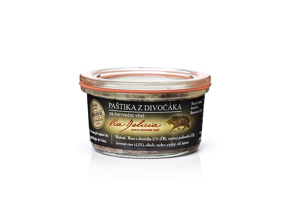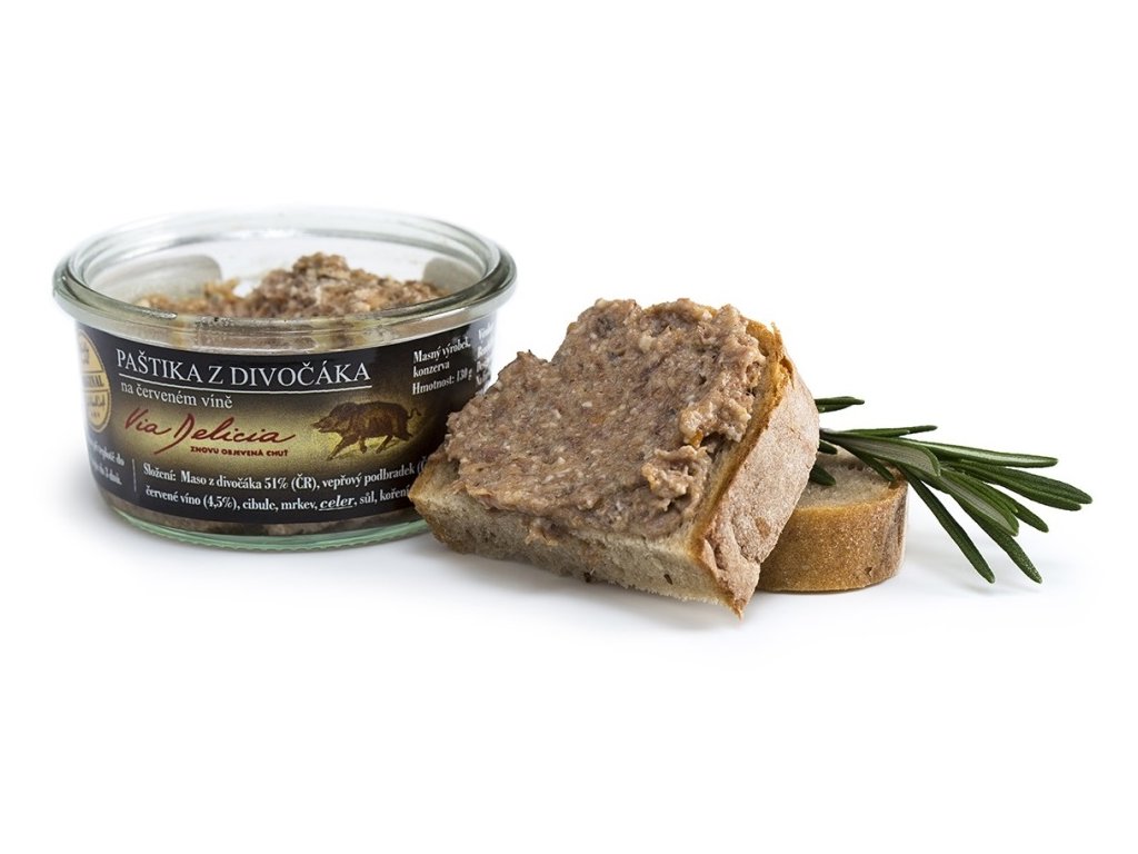 Složení: maso z divočáka (51%), vepřové maso, červené víno (4,5%), cibule, mrkev, celer, sůl, koření