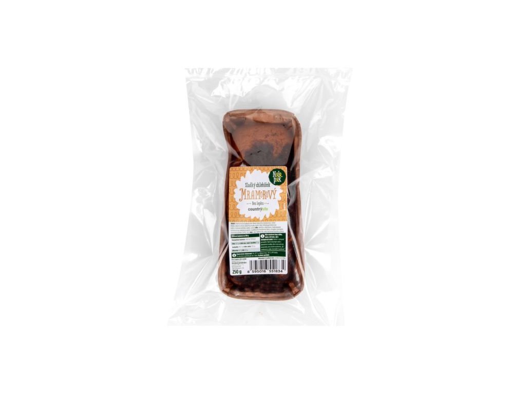 Složení: Kakaová bezlepková směs (kukuřičný škrob, bramborový škrob, kakaový prášek, kypřící látky: E450, E500, sušené BÍLKY, stabilizátory: E464, E415, modifikovaný bramborový škrob, emulgátor: rostlinného původu E471, sůl), světlá bezlepková směs (kukuřičný škrob, bramborový škrob, rýžová mouka, kukuřičná mouka, kypřící látky: E450, E500, dextróza, stabilizátory: E464, E415, modifikovaný bramborový škrob, emulgátor: rostlinného původu E471, sůl), VEJCE, cukr, řepkový olej, voda, konzervant: kyselina sorbová. Může obsahovat stopy skořápkových plodů, sóji, mléka, hořčice, celeru, lupiny (vlčí bob) a sezamu.
