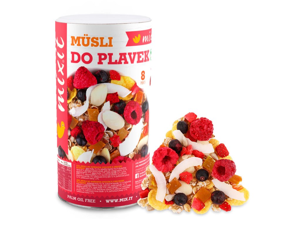 Složení: ječné vločky 15,5 %, kukuřičné lupínky 14,5 % (kukuřičná mouka 87 %, ječmenný sladový extrakt, jedlá sůl), ovesné lupínky 14,5 %, pšeničné lupínky 14 %, sójové vločky 14 %, plátky mandlí 5,5 %, sušená meruňka 5,5 % (meruňka 97 %, rýžová mouka 3 %), kokosové plátky 5,2 %, slunečnicová semena 5 %, pufované amarantové perličky 2 %, lyofilizovaný černý rybíz 1,6 %, lyofilizované jahody 1,4 %, lyofilizované maliny 1,3 %